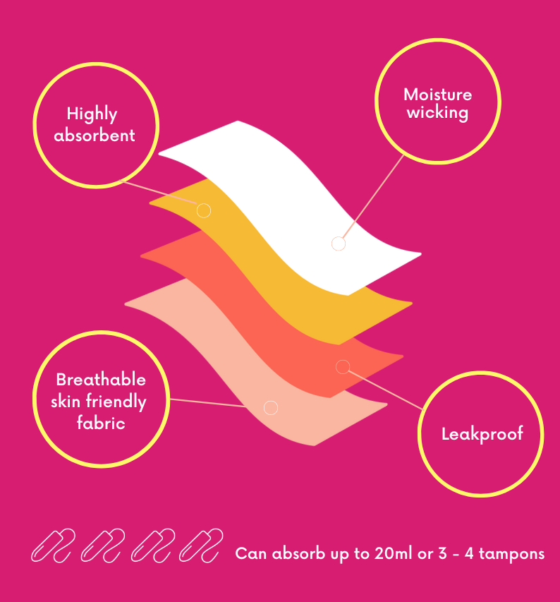 Die vier Schichten des diskreten Zwickels nehmen bis zu 20 ml Flüssigkeit (etwa 4 Tampons) auf. Damit bist du vor Auslaufen geschützt und kannst dich unbesorgt bewegen – bei der Arbeit, im Alltag oder beim Sport.
